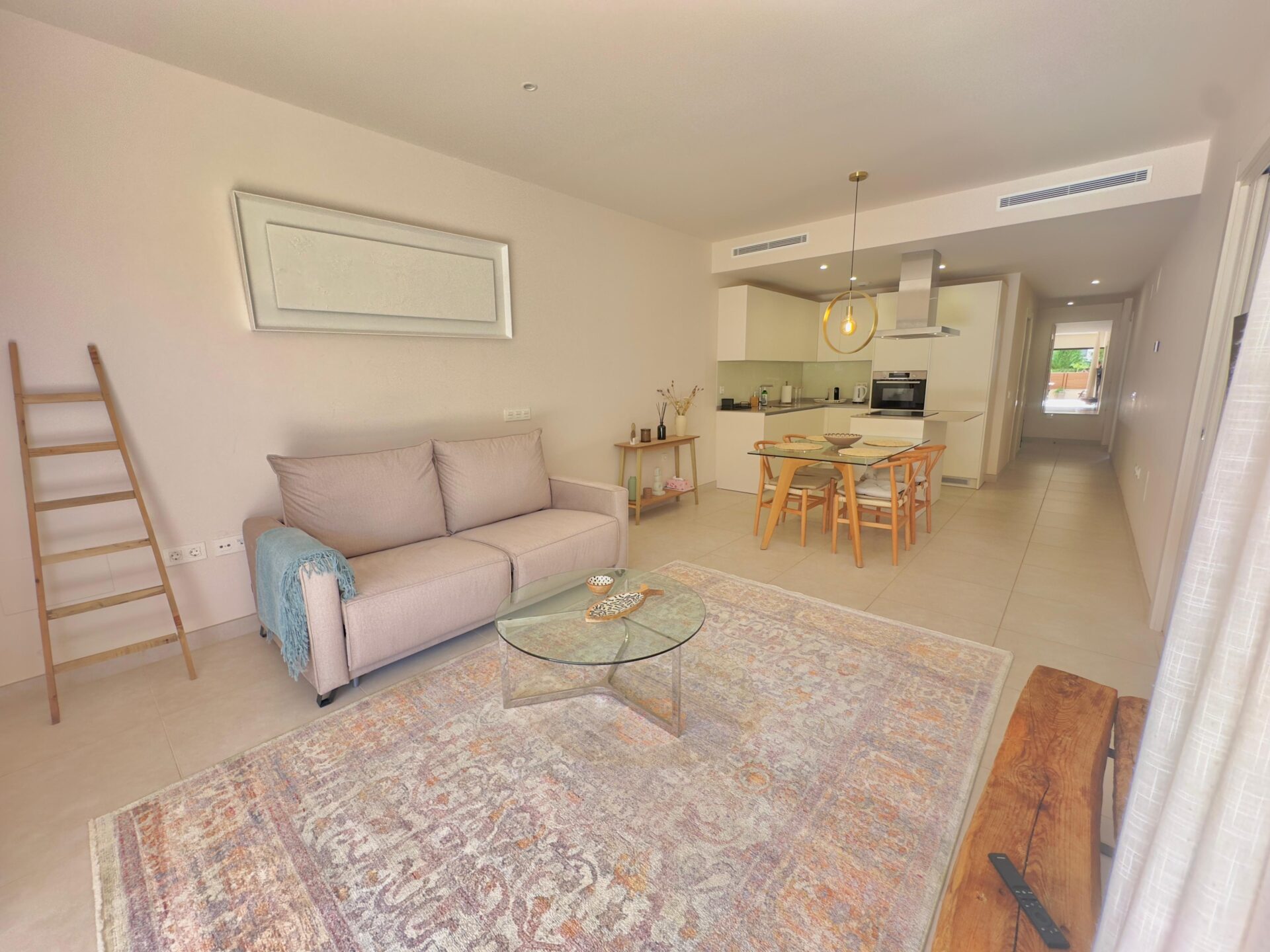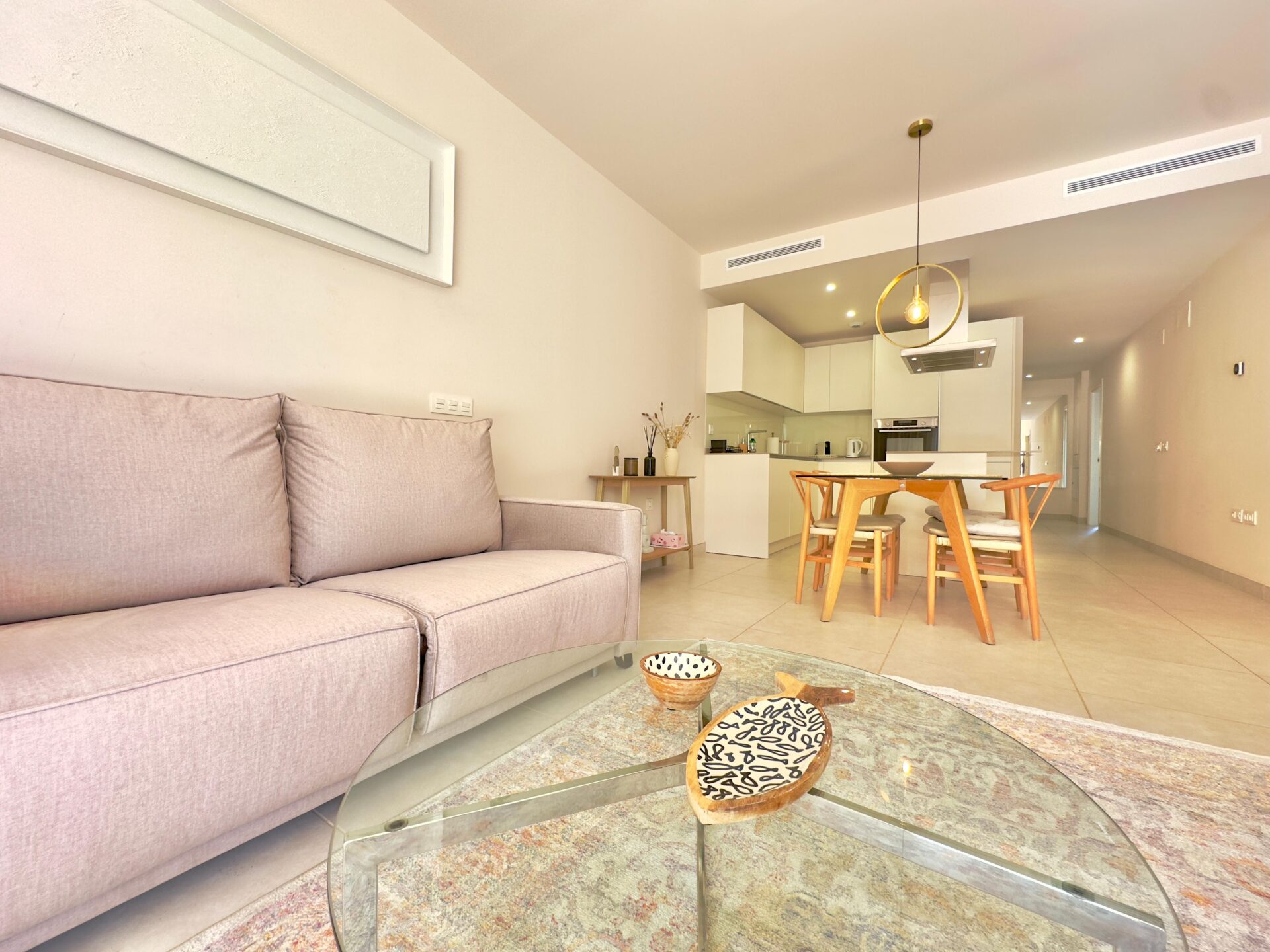 The property offers 2 spacious bedrooms and 2 bathrooms, with a bright open-plan living and dining area that leads directly onto a large, sunny terrace — perfect for outdoor dining, relaxing, and enjoying the Mediterranean climate.